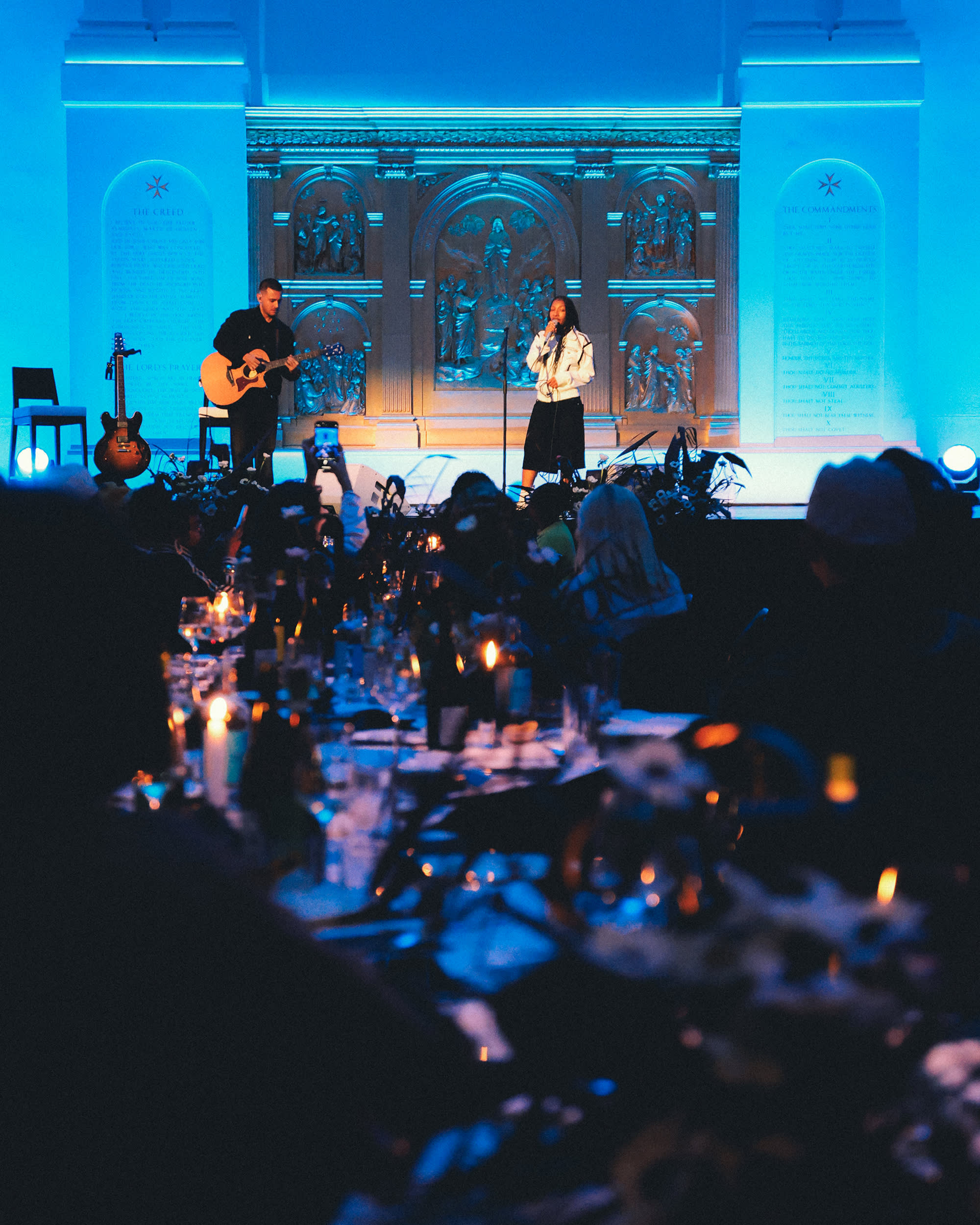 Celebrating the launch of END. and adidas’ ‘Tying the Knot’ collaboration, END. and iconic German sportswear brand invited friends and family to join us at East London’s Hackney Church for a night of nuptials and revelry. Hosted by Snake Denton, the evening saw the guests received with a drinks reception and their own pairs of the END. x adidas ‘Tying the Knot’ Superstar Vintage and Japan OG sneakers to have and to hold. Bathed in blue light and seated along winding tables in the centre of the 13th century church, now renovated as a modern-day event space, the evening’s wedding breakfast was provided by none other than chef Lee Tiernan’s FKA Black Axe Mangal.